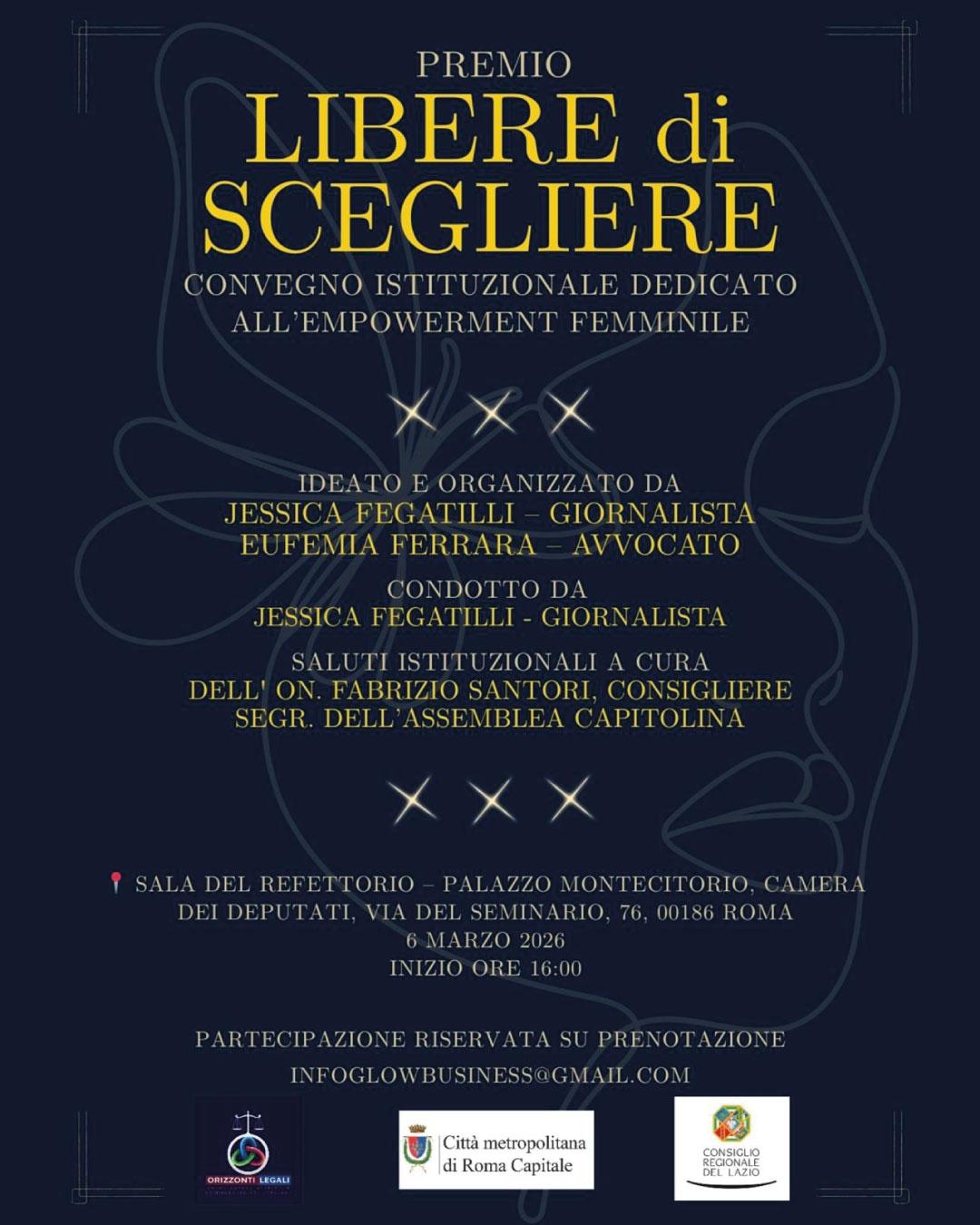Con il patrocinio della Città Metropolitana di Roma Capitale e del Consiglio Regionale del Lazio, “Libere di Scegliere” non è soltanto un premio, ma un manifesto culturale e civile. Ogni decisione, ogni passo verso il futuro rappresenta un gesto di consapevolezza e libertà. La libertà di scelta ci appartiene. E ogni scelta è un atto di coraggio.